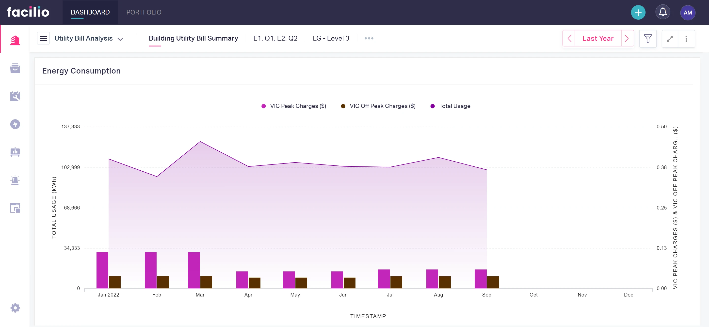 Facilio's utility bill analysis identified key factors driving utility costs, such as building demand, consumption, and peak hours. A dashboard with data on weekly consumption, peak and off-peak consumption, and max demand for the week was implemented, along with comparing long-term vs short-term changes. By this, the campus could track the increase in demand every week and the cost of those changes. Four energy meters gather this data and enable tracking energy consumption based on space and time period. Hence, the campus achieved improved energy management and substantial cost savings through real-time monitoring. For example, The campus had a high demand during Jan, and by using Facilio's platform, the campus took proactive measures based on the insights provided and modified their utility usage, which led to a reduction in the bill amount for the entire year.