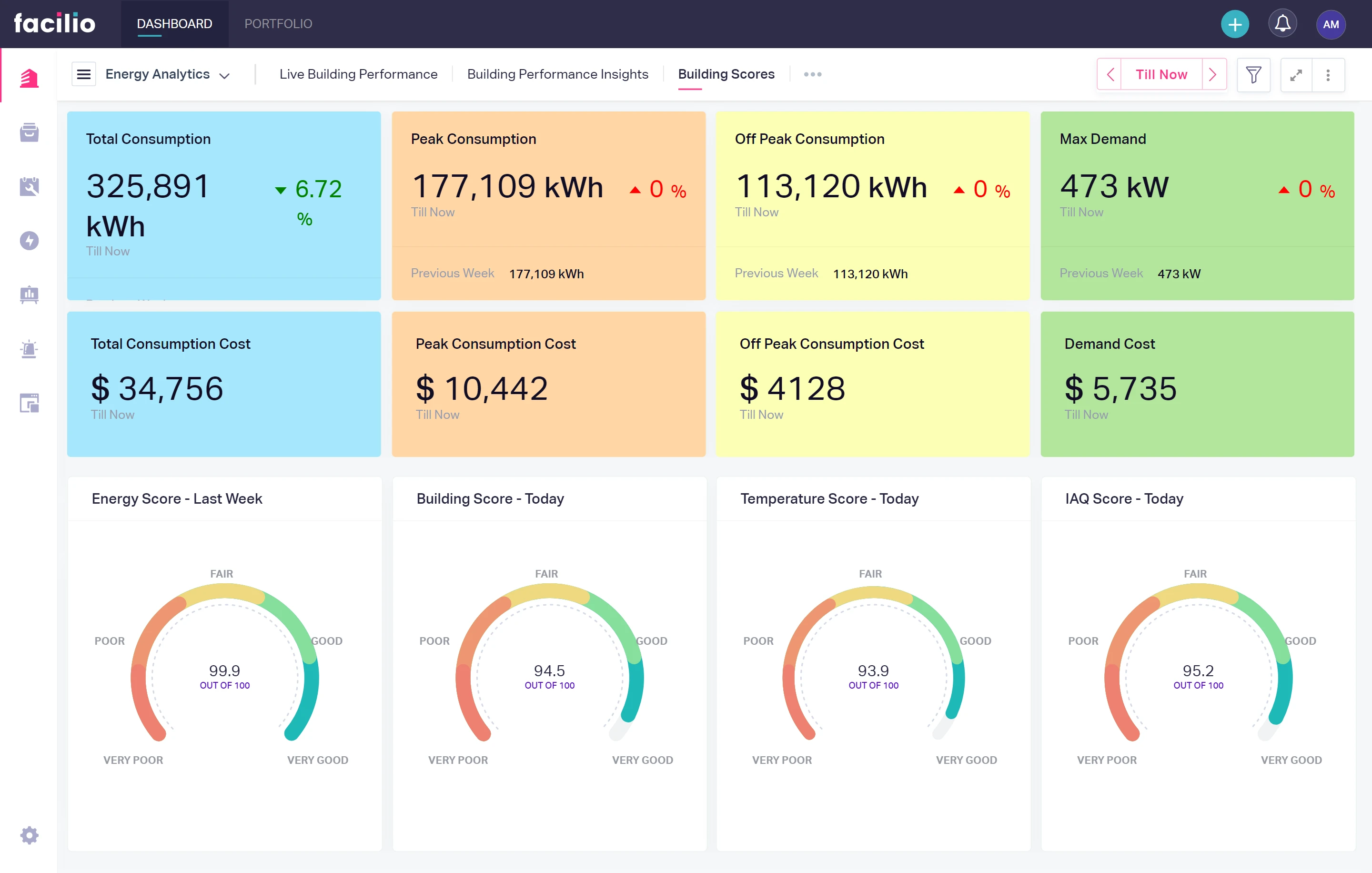 Facilio's advanced energy analytics empowered the campus to compare current and historical building performance, optimize chiller operations based on occupancy and identify areas for improvement, resulting in cost savings and improved sustainability. There is also a scoring system for temperatures and CO2 telemetry data, and these scores are further broken down based on asset types and displayed as charts that point out the worst-performing areas in the building.
