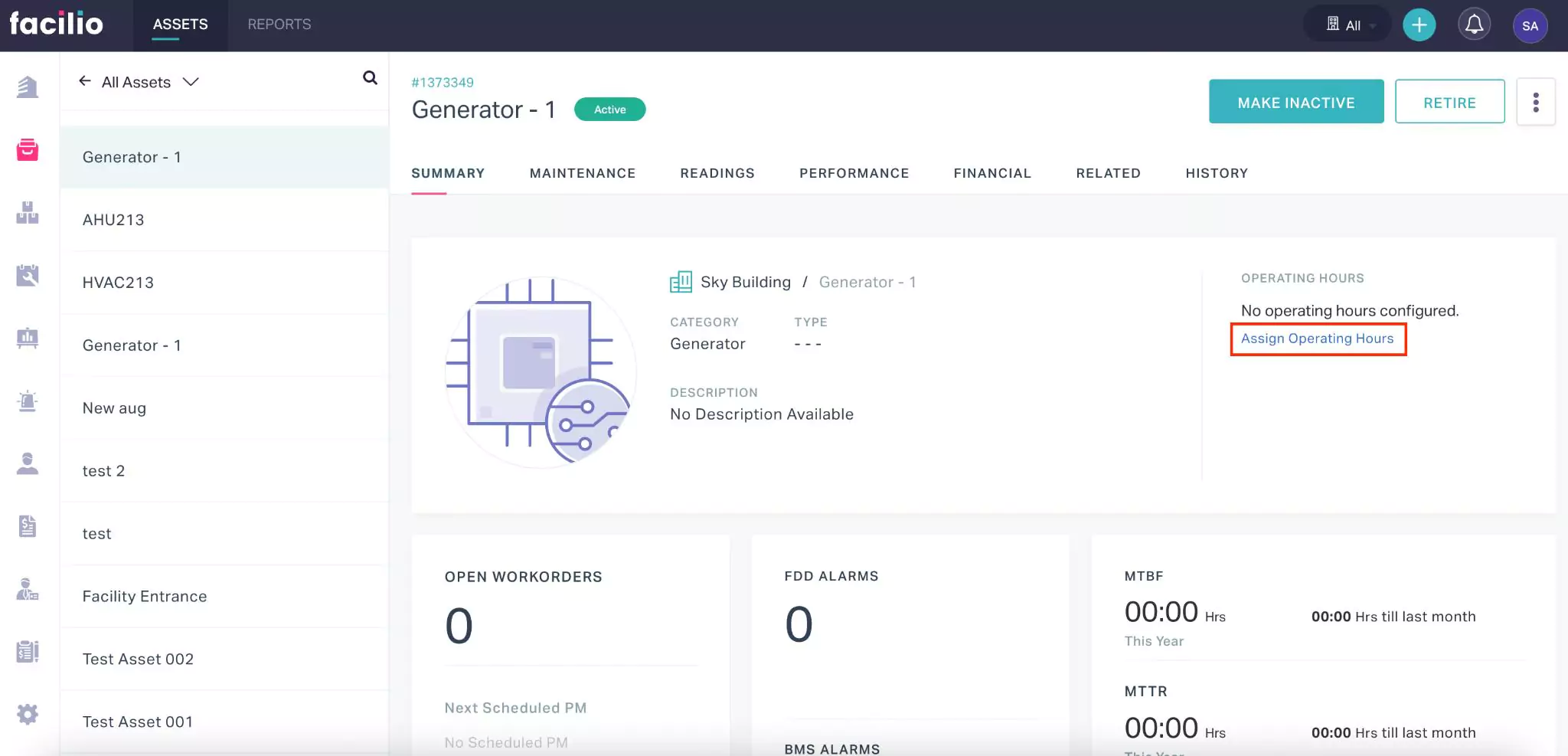 The operating hours created in this module can be used while assigning operating hours for sites, assets, and buildings across the application. This section illustrates a sample configuration in the Assets module. To assign operating hours,