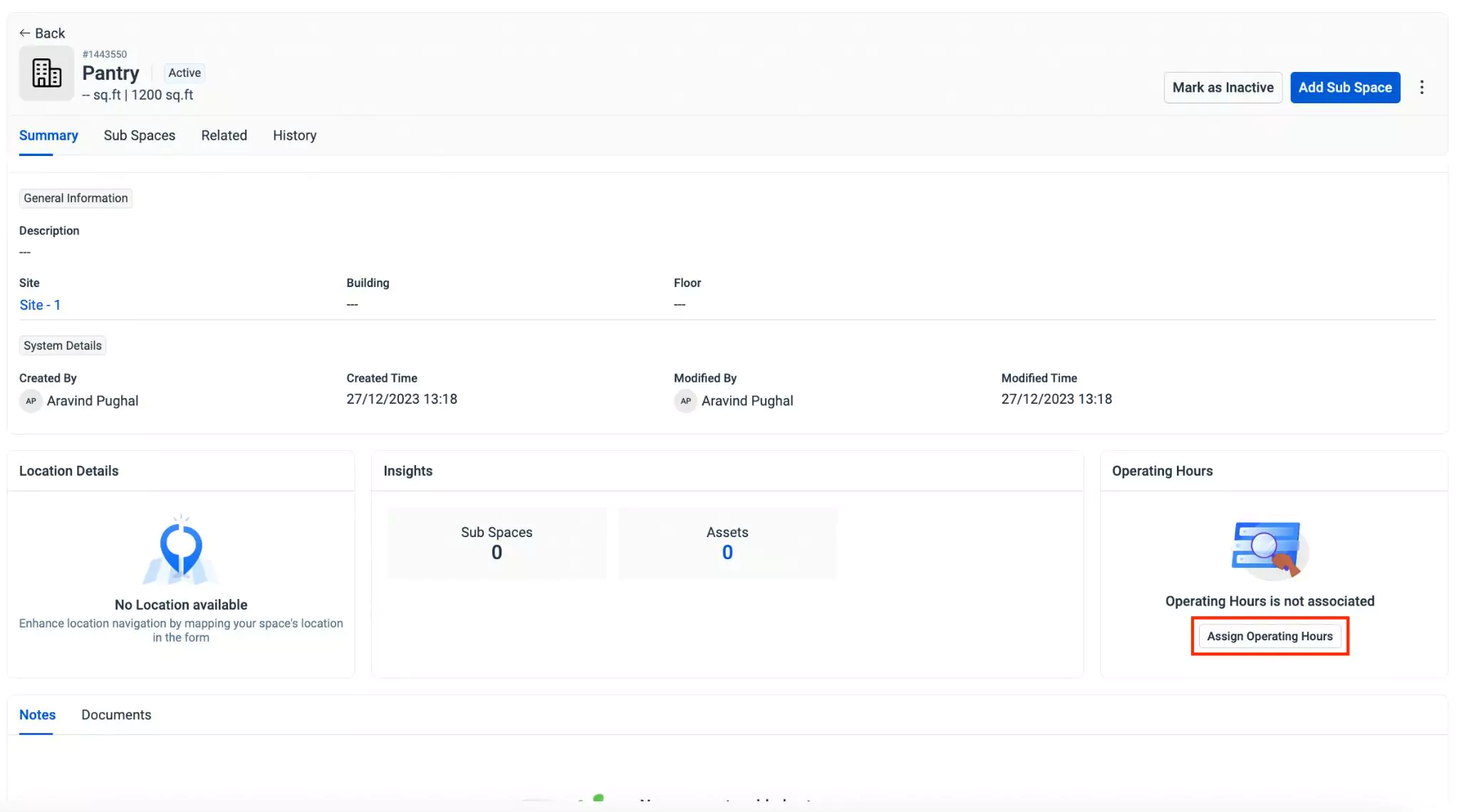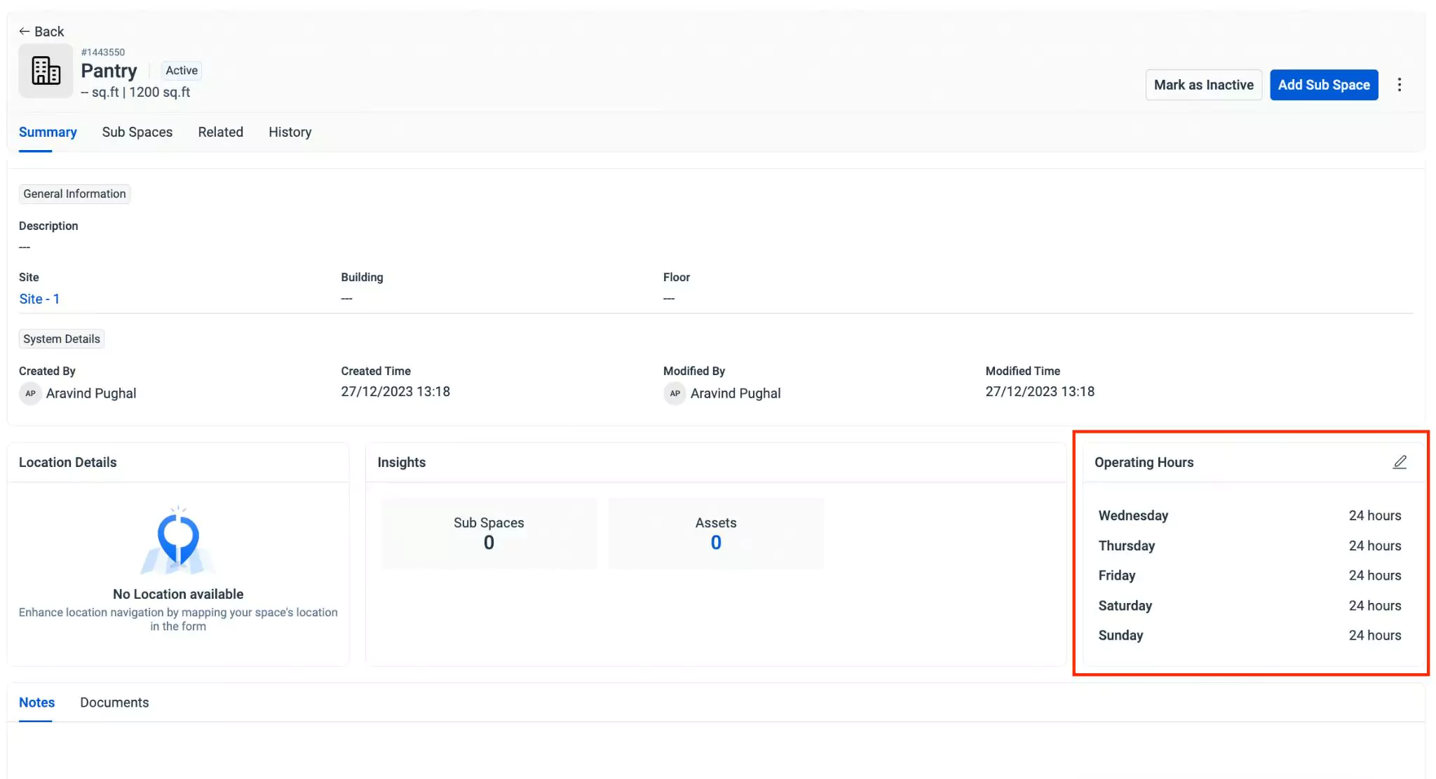 The operating hours refer to the business or working hours of an organization. In the Portfolio module, specifying the operating hours of the components such as sites, buildings, floors, spaces, and sub spaces provides a clear understanding to the clients on when to reach out to them for availing the respective services.
