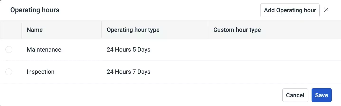 Click the Assign Operating Hours link in the Operating Hours card. The Operating Hours window with the list of operating hours is displayed.