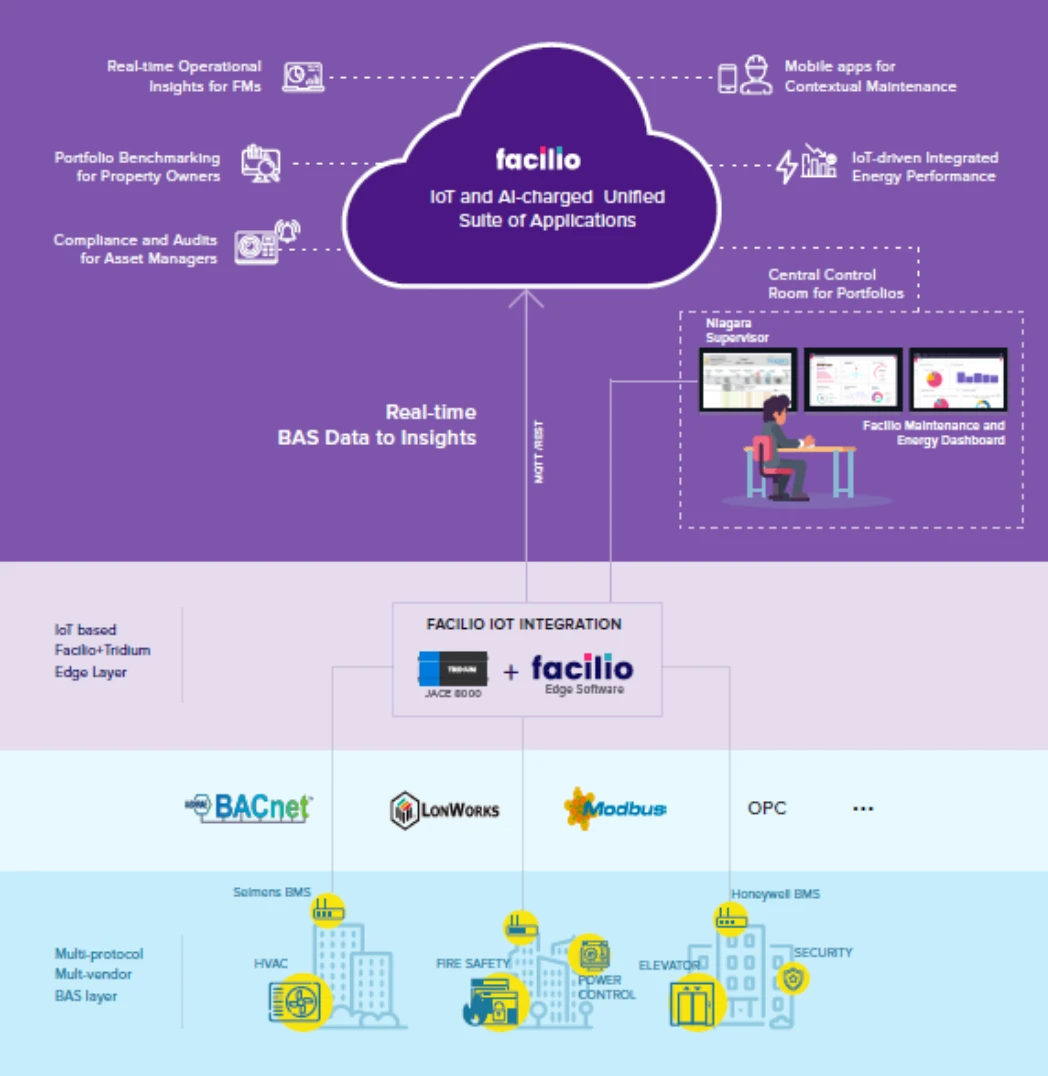 Facilio’s unique IoT driver can connect to all standard protocols including BACNET/IP, Modbus, OPC, oBIX etc. Any additional protocol can be supported at request as we have.